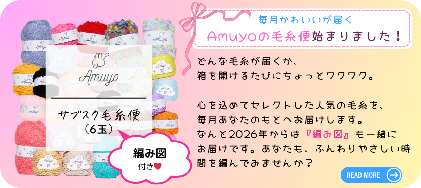 AmuyoのKitは 初心者さんにも作りやすく、経験者さんにも出来上がりの可愛さにワクワクできるものとなっています。可愛い毛糸が完成までの道のりを楽しくさせてくれます。
